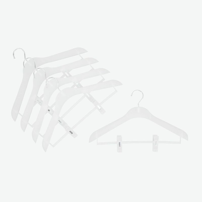 収納性を追求したスリム設計なスーツハンガー。お得な5本組セットです。 肩部分の先端がラウンド形状で、肩のラインを内側からキープします。 強力クリップ付でパンツ、スカートもまとめて収納できます。