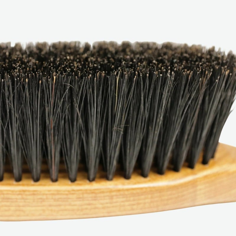 ブラシ部には中国 重慶産のしなやかで腰の強い豚毛を使用。静電気を起こしやすい化学繊維を一切使わずに、天然の素材にこだわって丹念に仕上げたブラシです。