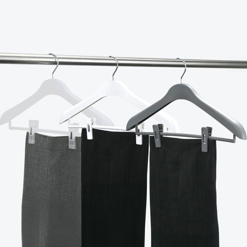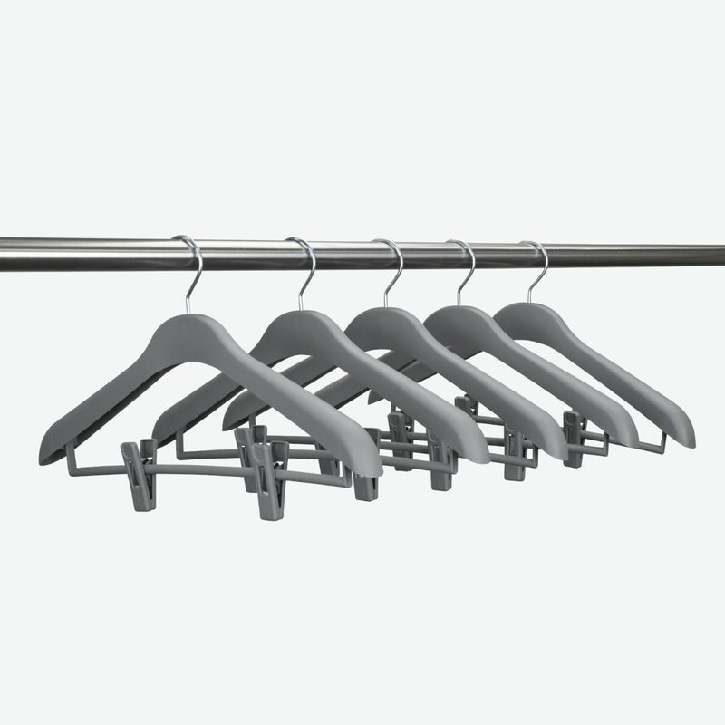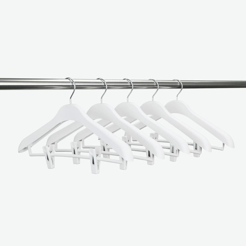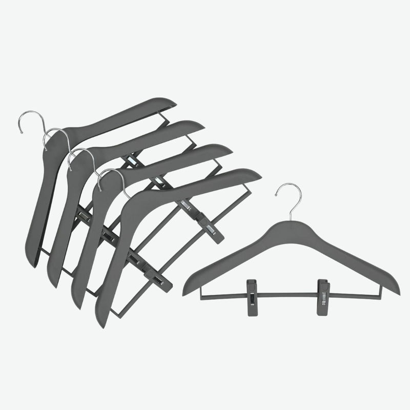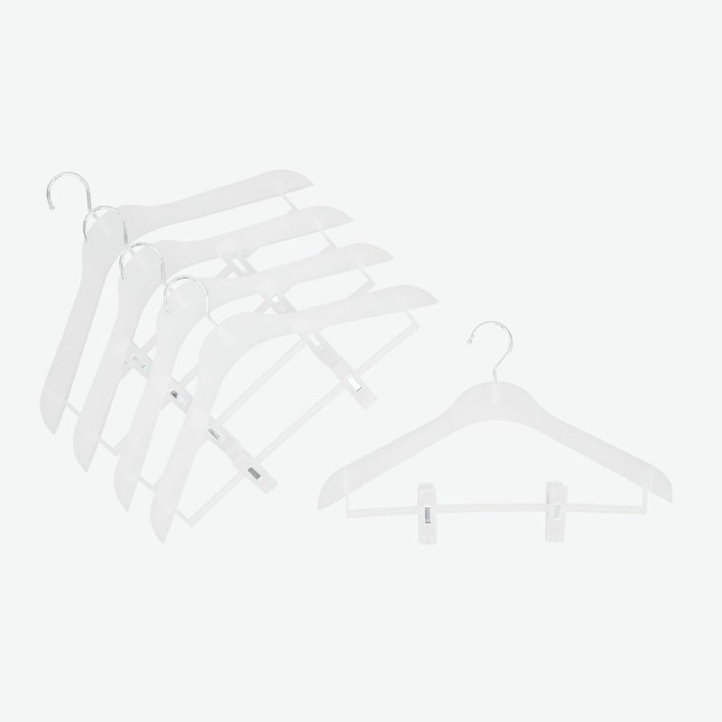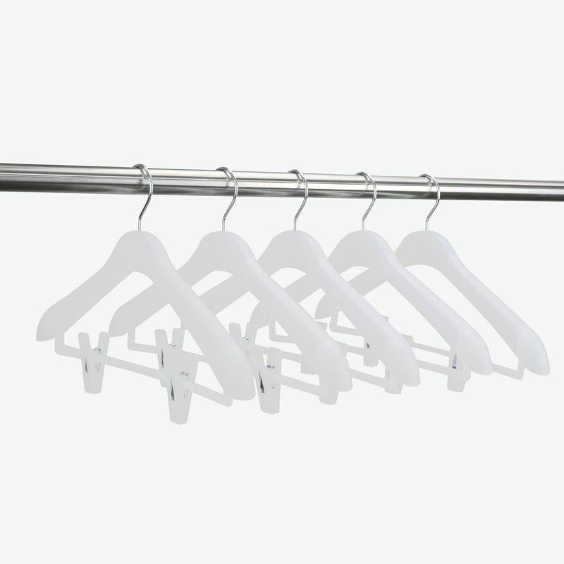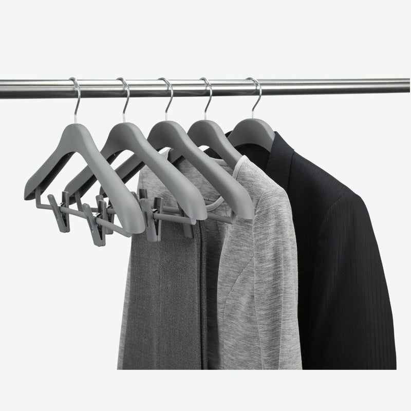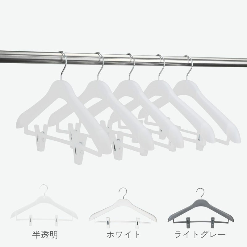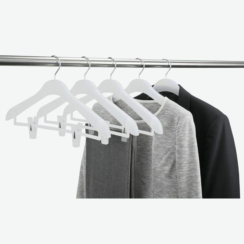 収納性を追求したスリム設計なスーツハンガー。お得な5本組セットです。 肩部分の先端がラウンド形状で、肩のラインを内側からキープします。 強力クリップ付でパンツ、スカートもまとめて収納できます。