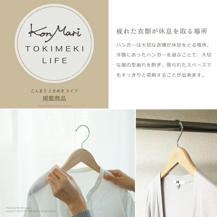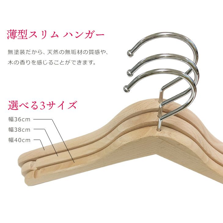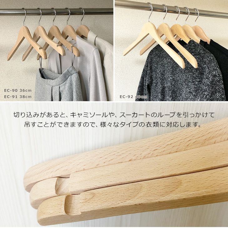 天然の無垢材の質感や、木の香りを感じることができる、無塗装のハンガーです。 シャツにお薦めなハンガーで、薄型で省スペースながら、屈折した形状でシャツの型崩れを防ぎます。 サイズは、幅36cm・38cm・40cmと小さいサイズの方から男性まで対応することができます。 また肩の部分の切込みにはキャミソールや、スーカートのループを引っかけて吊すことができますので、様々なタイプの衣類に対応致します。 ※EC-92 幅約40cmのタイプには切込みはございません。