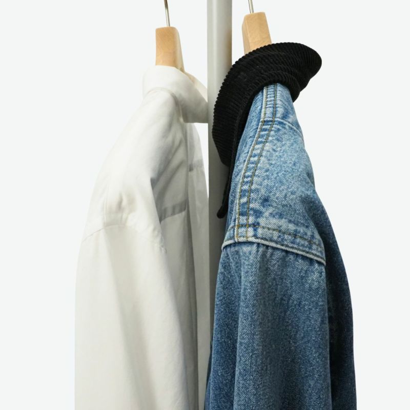 合わせ木ハンガーとは、木材の端材を再利用したサステナブルなハンガーです。 パッチワークのように一つひとつ異なる木目が特徴で、世界に一つだけのデザインを楽しめます。 天然木の温もりを感じさせながらもクローゼット全体の雰囲気を損なわず、服の魅力を引き立てる存在感があります。 日常の小さな行動からサステナブルな選択を始めてみたい方におすすめです。 ジャケットやコートやブルゾンなどのアウター用のハンガーです。 ジャケットの型崩れを防ぐ機能を追求して作られたハンガーで、人体工学にのっとって前傾させた美しいラインをもっております。 アンダーパーツがないので、上着とパンツを分けて収納したい方にピッタリです。