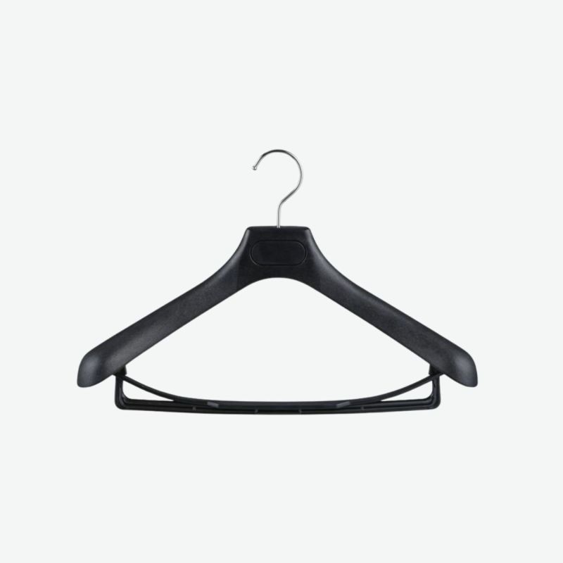 アパレルのShop用として開発されたプラスティックハンガーです。スーツの肩崩れを防ぎ、大切なスーツを美しく保ちます。 ハンガー全体にシボが入っているのと、黒発泡素材を使用しているため、一般的なプラスチックハンガーより高級感が増しています。