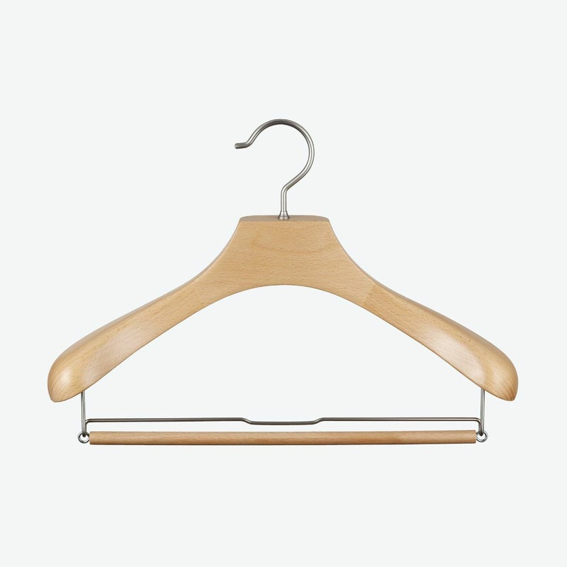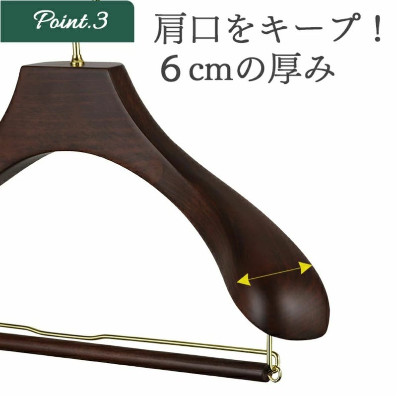 【FSC®認証材使用:未来へつなぐサステナブルな選択】 このハンガーは、環境に配慮し、FSC®認証材を使用して製造されています。 FSC®マークは、森の生態系、社会、経済的な持続可能性を守って管理された木材の証です。このハンガーを選ぶことは、SDGs達成への貢献となり、お客様のクローゼットから無理なく森の豊かな恵みを未来へつなげる行動となります。 【服の形を守る「立体美」を追求した設計】 大切なジャケットやスーツの型崩れを徹底的に防ぐ、機能性を追求しました。 人体工学に基づく前傾フォルム: 人の体に近い前傾した美しいラインと、十分な肩の厚みを持たせています。服がハンガーに沿うことで、シワを防ぎ、服の寿命を格段に延ばします。 グレードアップした肩の丸み: より人体型にフィットするよう、肩のラインをなだらかにし、丸みを増やしました。