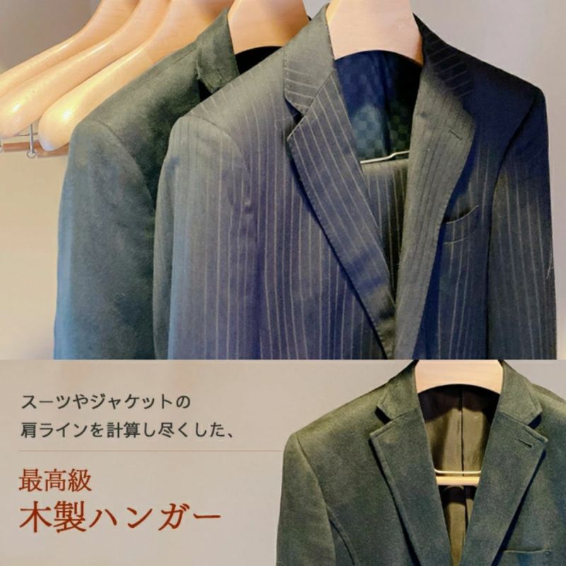 ネットを見ているとコートやスーツはハンガーも選んだ方が良いとの事を知りハンガーを探しはじめました。 色々なメーカーからハンガーが発売されており値段もピンきり。 機能性も見た目も両立した価格も手の伸ばしやすいものをないかと思っていたところ、このながしおハンガーに出会いました。 しっかりとした適度な重さのある木製にゴールドに輝く金属部品。 コートやスーツが型崩れしないようにしっかり作り込まれたデザイン。 同じような仕様のハンガーを他のメーカーで見ると2倍くらいの価格。 ながしおハンガーもそれくらいの価格だとしてもおかしくないくらいのクオリティですが、非常に良心的でまたハンガーを買い足すときにも非常にありがたいです。 自分はコート用に買いましたが、肩の部分に吸い付くようにフィットして冬以外の着ない時にも型崩れの心配がないように感じます。 リピート決定です!