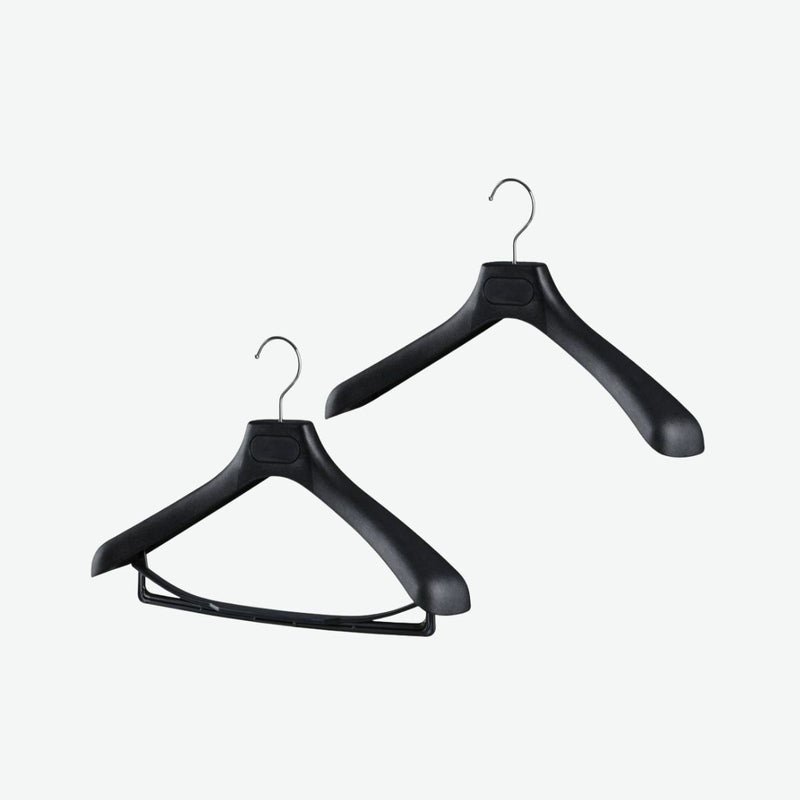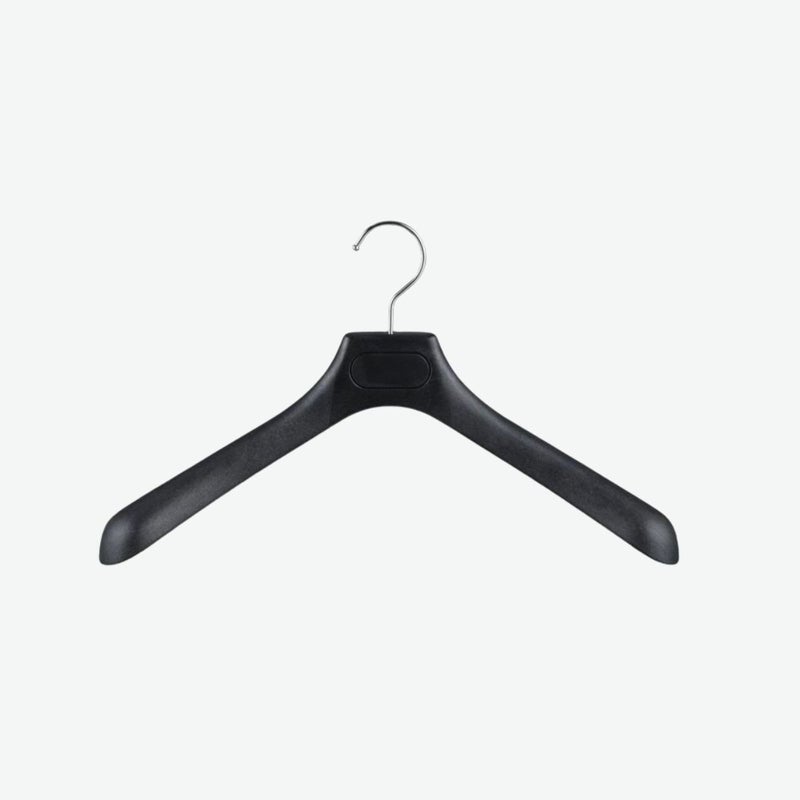 アパレルのShop用として開発されたプラスティックハンガーです。スーツの肩崩れを防ぎ、大切なスーツを美しく保ちます。 ハンガー全体にシボが入っているのと、黒発泡素材を使用しているため、一般的なプラスチックハンガーより高級感が増しています。