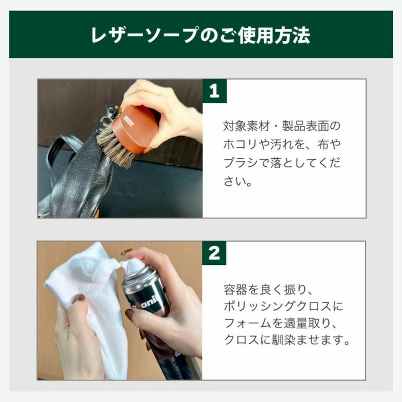 老朽化した革を引き締めながら汚れを落とします。 きめ細かい泡状のフォームスプレーで、スムースレザー・デリケートレザー・合成皮革をクリーニングして保護すると同時に、革に栄養を与えます。また、色の鮮明さを復活させる効果もあります。