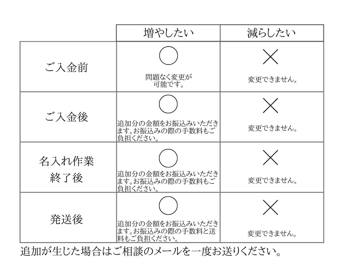 通常ご購入の方はメールお打合せの段階で、ご入金ください。混雑状況によって異なりますが、ご入金の確認後、1か月程で名入れ完成予定となります。ご入金が確認できませんと、ご希望の納品日にお届けできない事もございますのでご注意くださいませ。