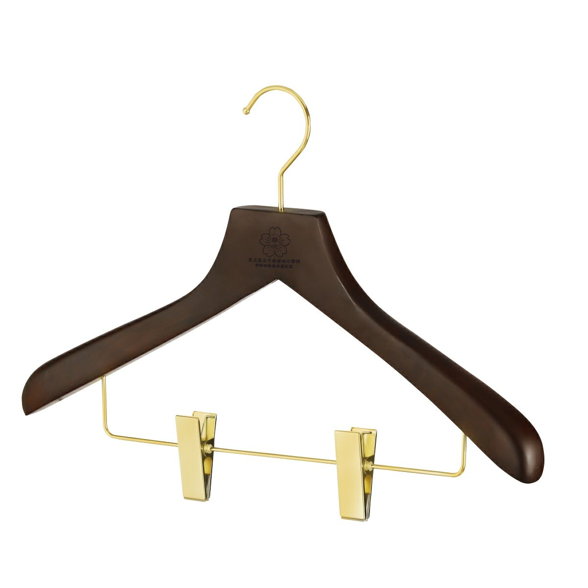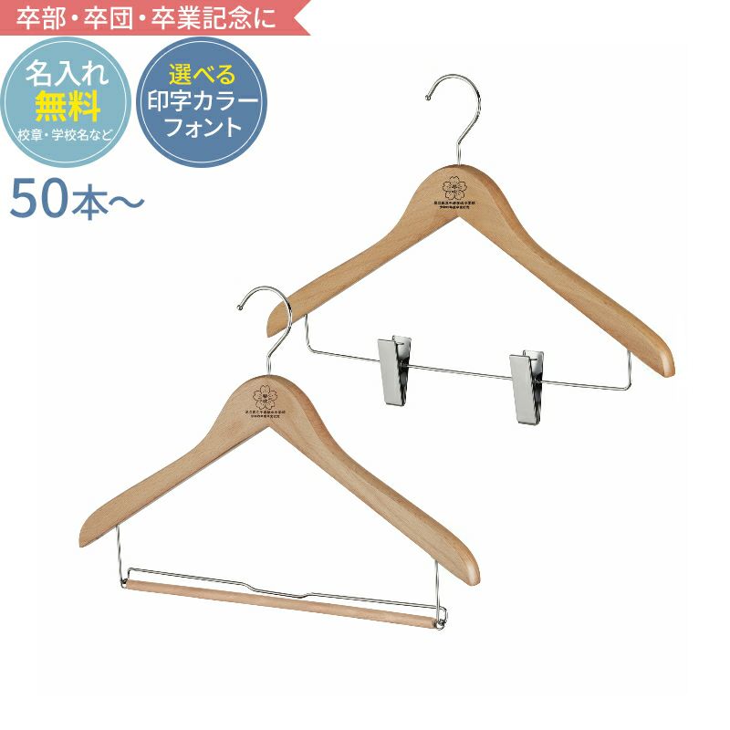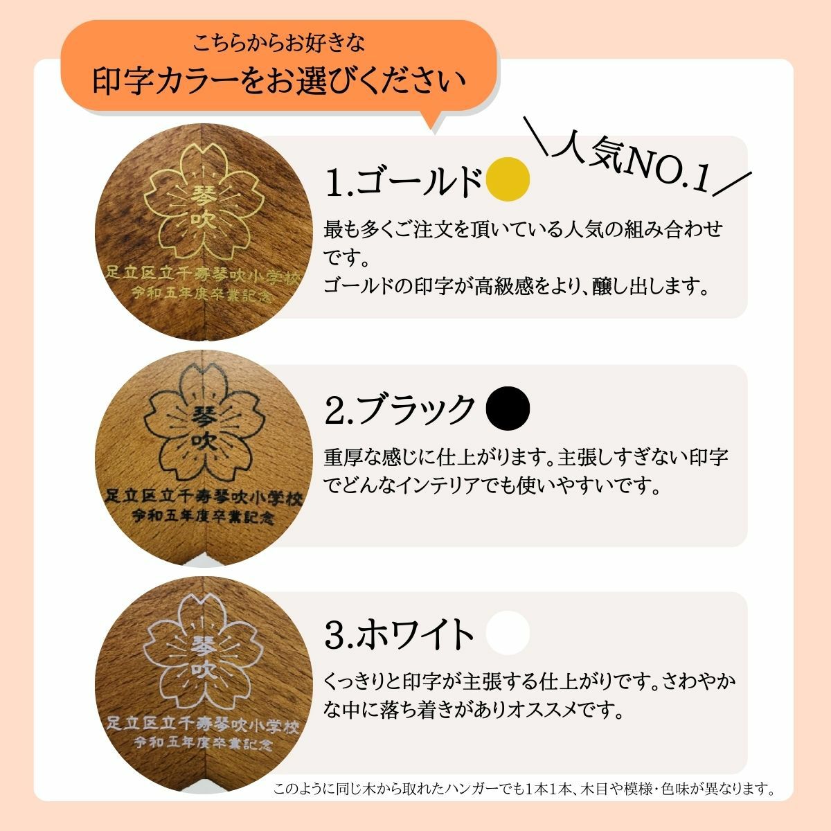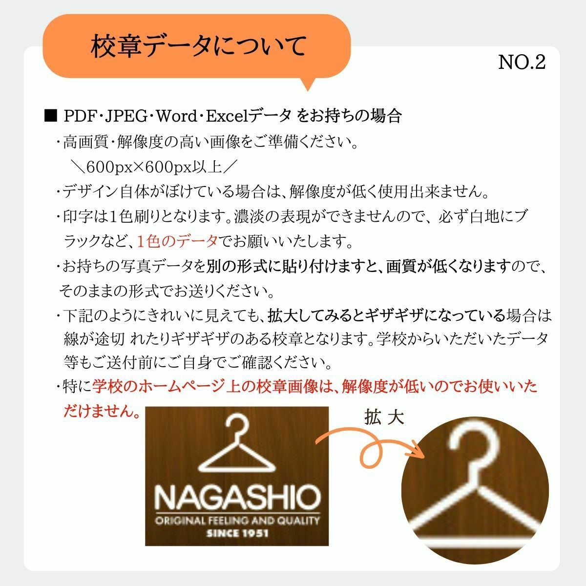 毎日学校に行くとき、帰ってきて制服を掛けるとき、必ず手にするハンガー。そのハンガーに、校章・学校名・記念名を刻印風に印刷できます。