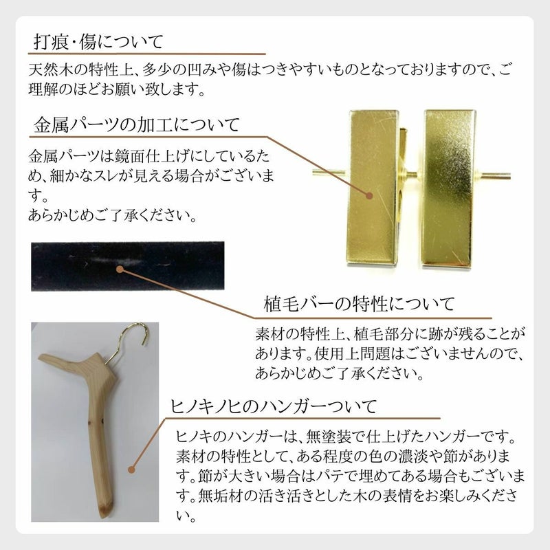 優しい香りが広がる木目の美しいヒノキのハンガーです。 ヒノキの香り成分にはアロマ効果の他に防虫、消臭効果もあると言われております。 計算された屈折と適度な厚みによって洋服の型崩れを防ぎ、 ヒノキ特有の香り成分によってお気に入りのお洋服を長く大切に保ちます。 ※香りが弱まったら: 表面をサンドペーパーで軽く磨いてください。 再び優しい香りが広がります。 ※SDGsへの取り組み: 国産ヒノキの背板と呼ばれる端材を有効活用したエシカルなハンガーです。 限られた資源を有効活用することにより日本の林業の活性化に貢献します。 ※ヒノキの樹液(ヤニ)について: 無塗装の為、樹液(ヤニ)が染み出していることがあります。ヤニが出るのは、自然のままの木材を使っているためです。 人体には無害ですが、ベタつきが気になるという場合は「無水エタノール」を含ませた布で気になる箇所を拭いて、 直射日光の当たらない日陰で自然乾燥したり、紙やすりで磨いてください。