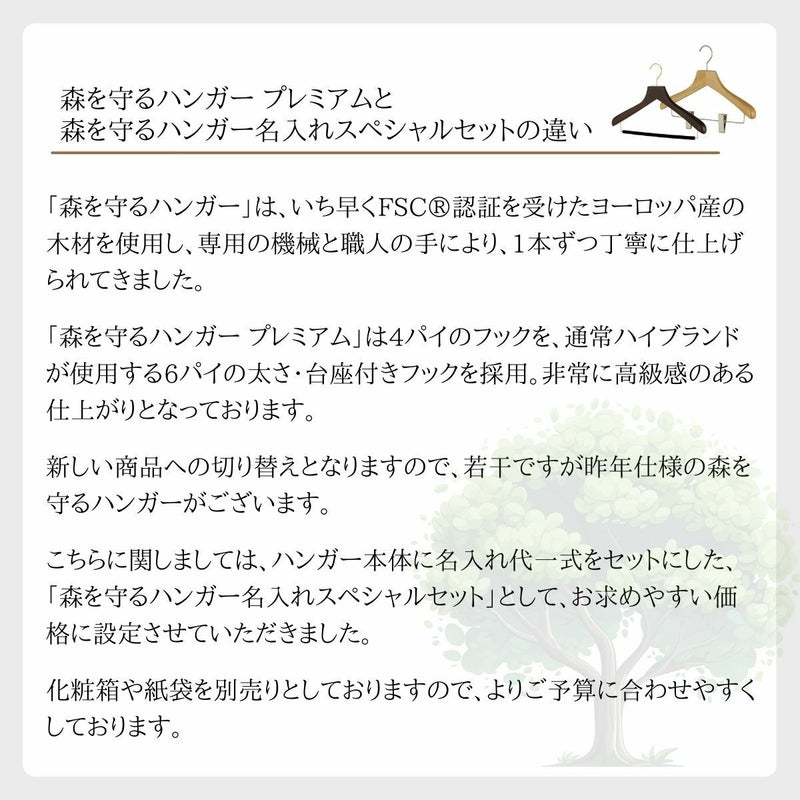 こちらの商品は商品入れ替えのための、ハンガー1本と名入れ代一式の、スペシャル名入れセットとなります。 化粧箱や紙袋が必要の方は別途お買い求めください。 スペシャルプライスのため、名入れ作業終了後30日以内に発送とさせていただきます。ご了承の上ご注文くださいますようお願いいたします。 FSC®認証材で作られた卒業記念ハンガーです。 FSC®マークは、国際的に認められた厳しいチェック基準をクリアした製品だけにつけることができます。 森を守るセットをお選びいただくことで、SDGsの達成に協力することになり、気軽に無理なく森の豊かな恵みを未来へつなげることができます。 またこちらのハンガーは、厚さ3cmで人体工学にのっとった肩のラインが制服の型崩れを防ぎます。 ズボンを掛けてもすべらない植毛バーに致しましたので、ハンガーに掛けるのが面倒くさいお子様でも、さっと掛けてズレ落ちません。 クリップタイプは幅38cmと幅42cmをご用意致しましたので、男子でも女子でも対応可能です。 カラーはさわやかなナチュラルカラーと、高級感あふれるブラウンからお選びいただけます。 ハンガー1本、名入れ代一式、送料のセットとなります。 ※こちらのセットは50セット以上(42cm植毛バー 38cmクリップ 42cmクリップ 組み合わせ自由 )からのご注文となります。 ※校名だけでなく校章も入れたい場合Illustrator形式のデータをご用意いただきます。画像しかない場合、画像解像度によっては、ごくまれにトレース(図形化)が必要な場合もございます。 別途8800円~の費用が発生いたしますので、ご相談とさせて頂きます。