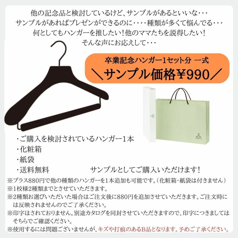 他の記念品も検討しているけどサンプルが欲しい。 サンプルを見せながらプレゼンがしたい。 有料でもサンプルが欲しい。 そんなお声にお答えして、有料サンプルを販売をさせていただくことになりました。 セット内容は ハンガー1本 化粧箱 紙袋 送料無料 ハンガー本体は、販売中の卒業記念ハンガーの中からお好きな商品1本お選びいただけます。プラス880円で合計2本までお選びいただけます。この場合ご注文後に880円追加させていただきます。(1校様2種類までとさせていただきます。) ※ご注意 ・名入れ無しでのお届けとなります。 ・2本お選びいただいても、紙袋・化粧箱は1セット分となります。 ・使用するには問題ございませんが、ハンガー本体には傷や打痕のあるB品となります。あらかじめご了承ください。
