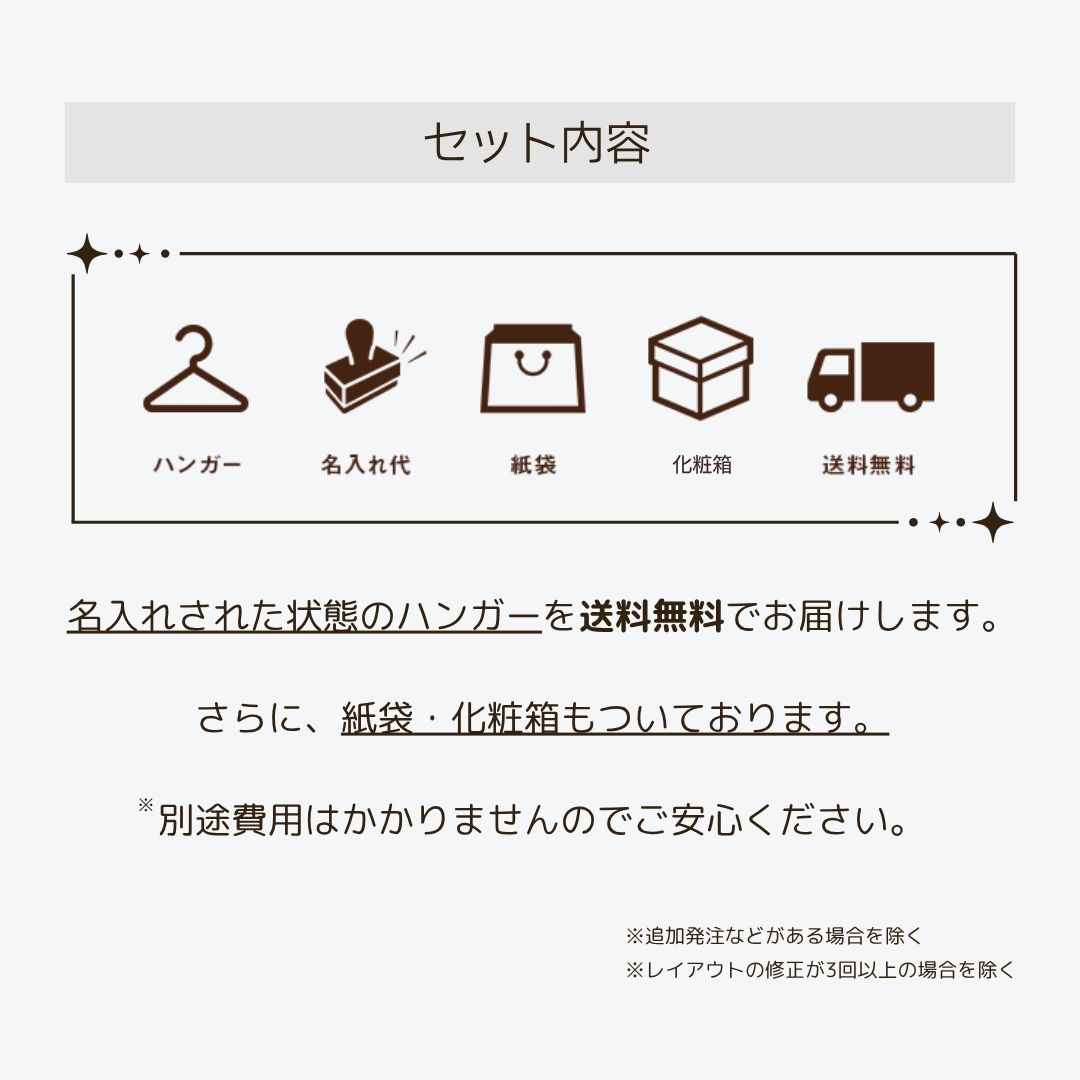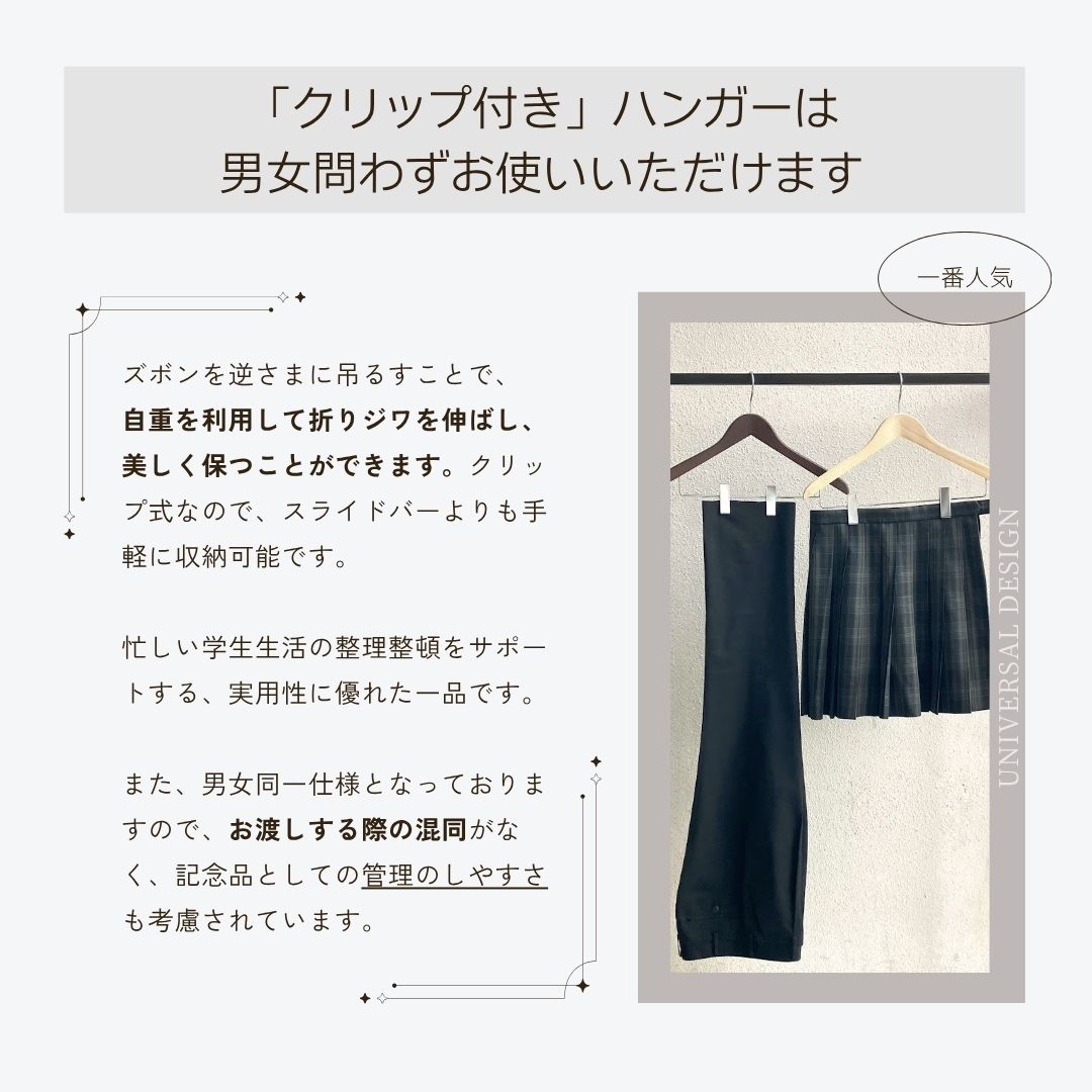 こちらは卒業記念ハンガーを1~19本ご注文の方専用ページです。 環境に配慮した「FSC®認証材」を使用し、SDGs達成にも貢献できる卒業記念ハンガーです。 人体工学に基づいた厚さ3cmの設計と、滑り止め付きのバー(またはクリップ)が、お子様の制服を型崩れから守ります。 カラーはナチュラルとブラウンの2色展開。名入れ・箱・紙袋がセットになったお得なセットです。 ※少しでもお安くご提供するため、箱詰め作業はお客様にてお願いしております。ご理解の程よろしくお願いいたします。