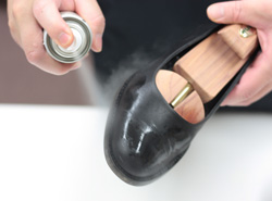 カビを取るクリーニングスプレーを靴に吹きかけ、布でふき取ります。