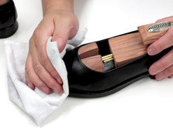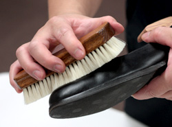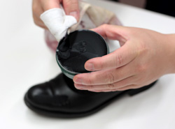 靴に光沢を出すため、乾いた布で磨き上げます。