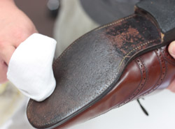 布(ポリッシングクロス)に靴用クリームを付けて汚れを落とします。